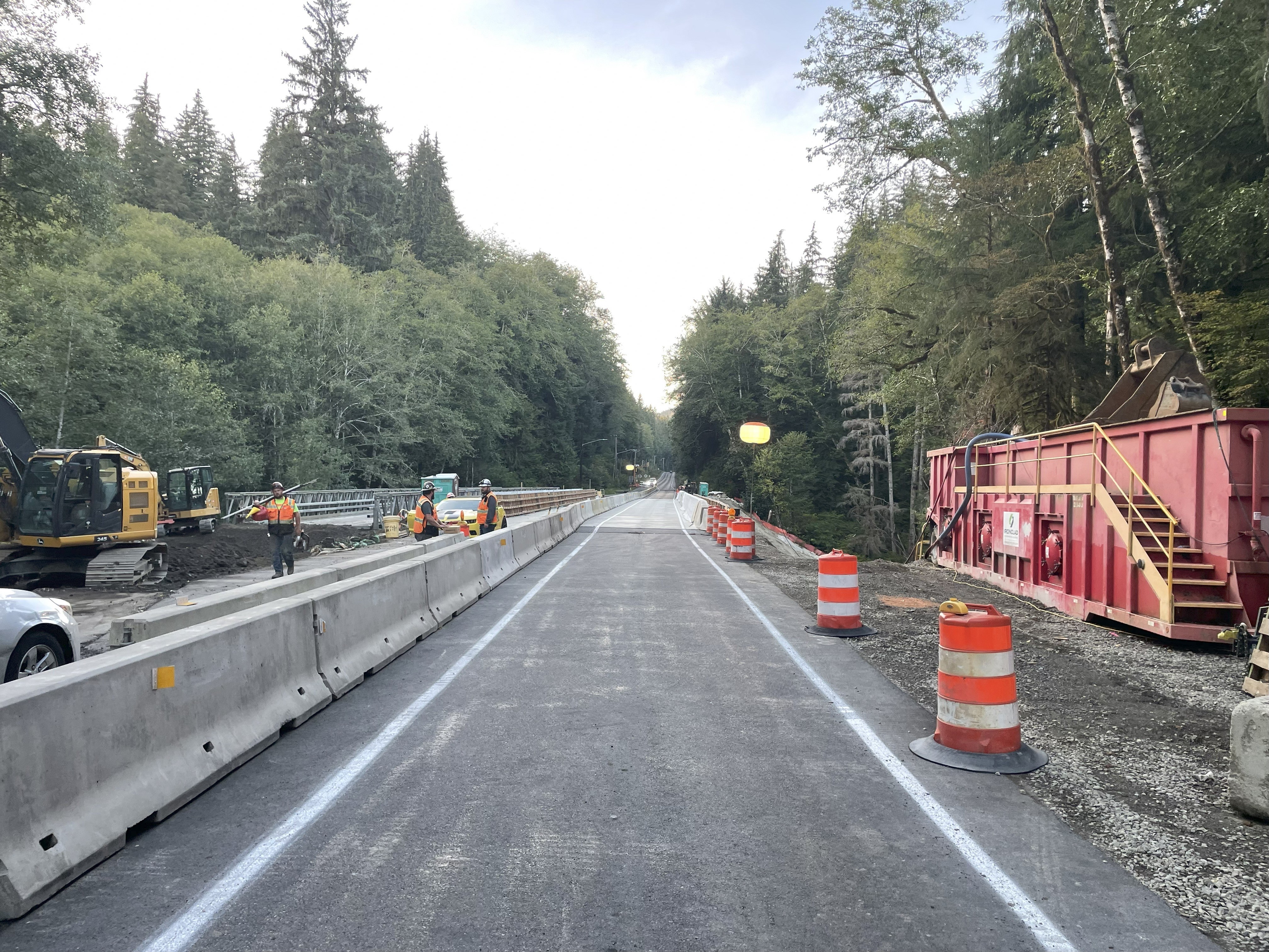This project replaces an outdated culvert along US 101 south of Forks identified as a barrier to fish migration. Crews have completed a 175-foot-long concrete girder bridge that replaces a 9-foot diameter metal pipe. Travelers will continue to see single-lane alternating traffic at the Jefferson-Clallam county line while crews rebuild the stream under the highway. The speed limit is reduced to 25 mph through the work zone.