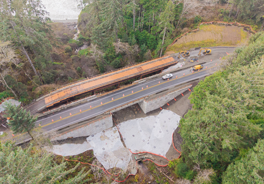 An aerial view of the new bridge next to the temporary bridge on US 101 near Ruby Beach.US 101 at Cedar Creek near Ruby Beach