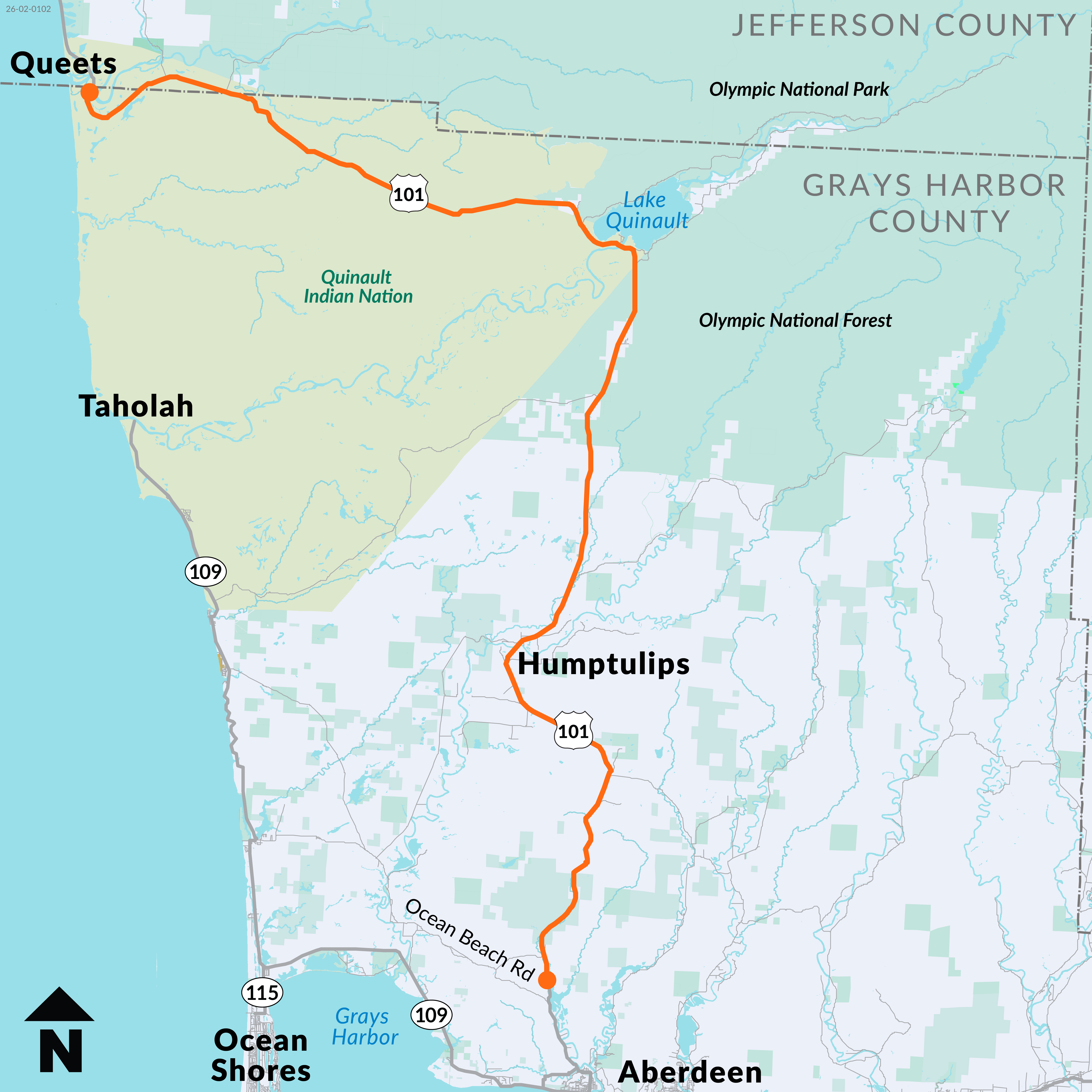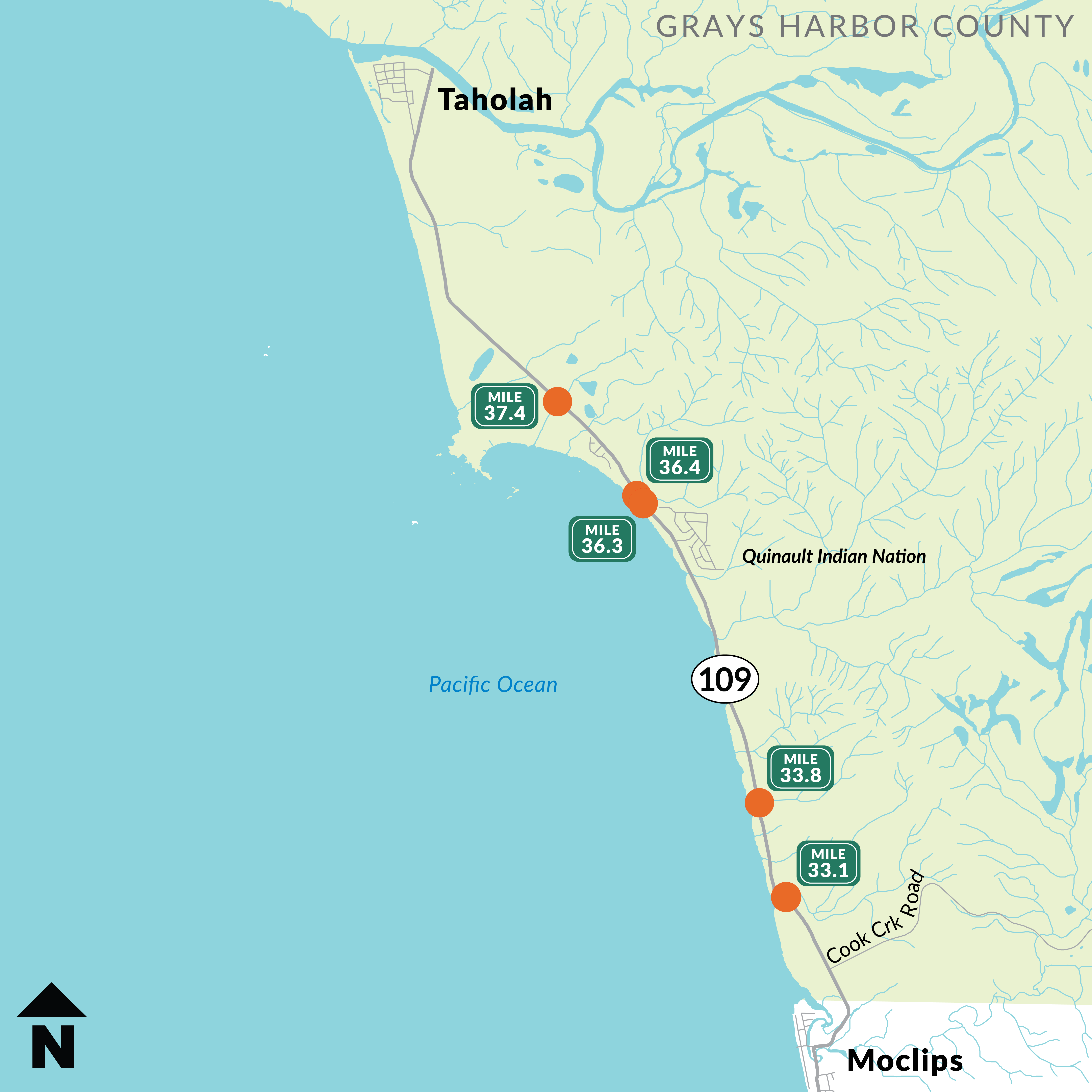 This project replaces outdated culverts under State Route 109 at five locations on the Quinault Indian Nation with bridges or larger culverts. Travelers will see flaggers or temporary traffic lights alternating traffic on a single lane through fall 2026. The speed limit will be reduced to 25 mph through the work zones. At some sites, travelers will see occasional closures of the highway up to 45 minutes. The closures allow crews to deliver large materials for bridge construction. Crews expect to complete work at two sites in fall 2026. All sites will return to one lane open in each direction with work stopping for winter. Crews will return to the other three sites to complete construction from spring through fall 2027.