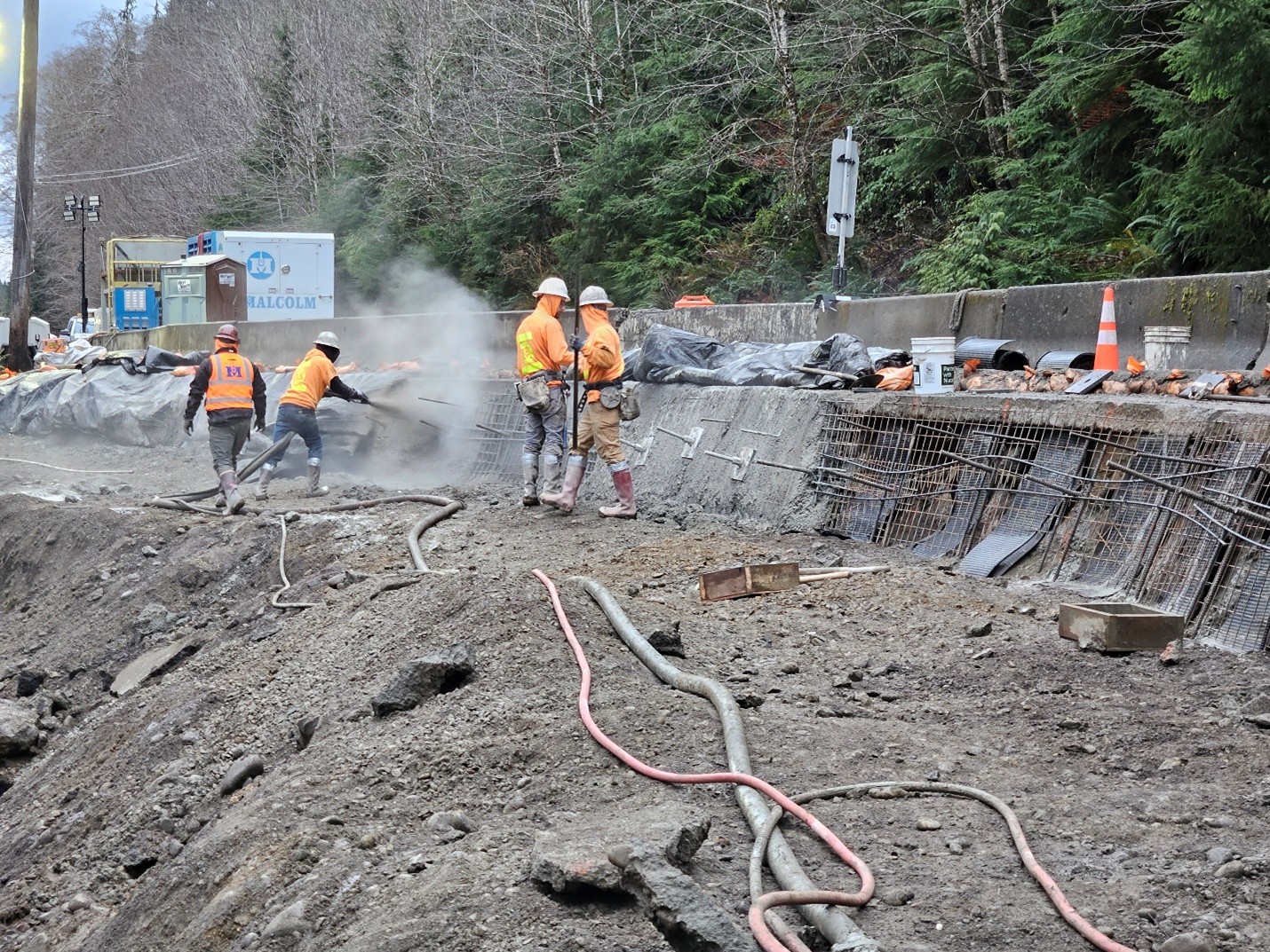 Contractor crews build a soil nail wall next to the northbound lane of US 101 in Jefferson County near Dowans Creek Road. The emergency repair will stabilize the slope above the Bogachiel River.Construction timeline