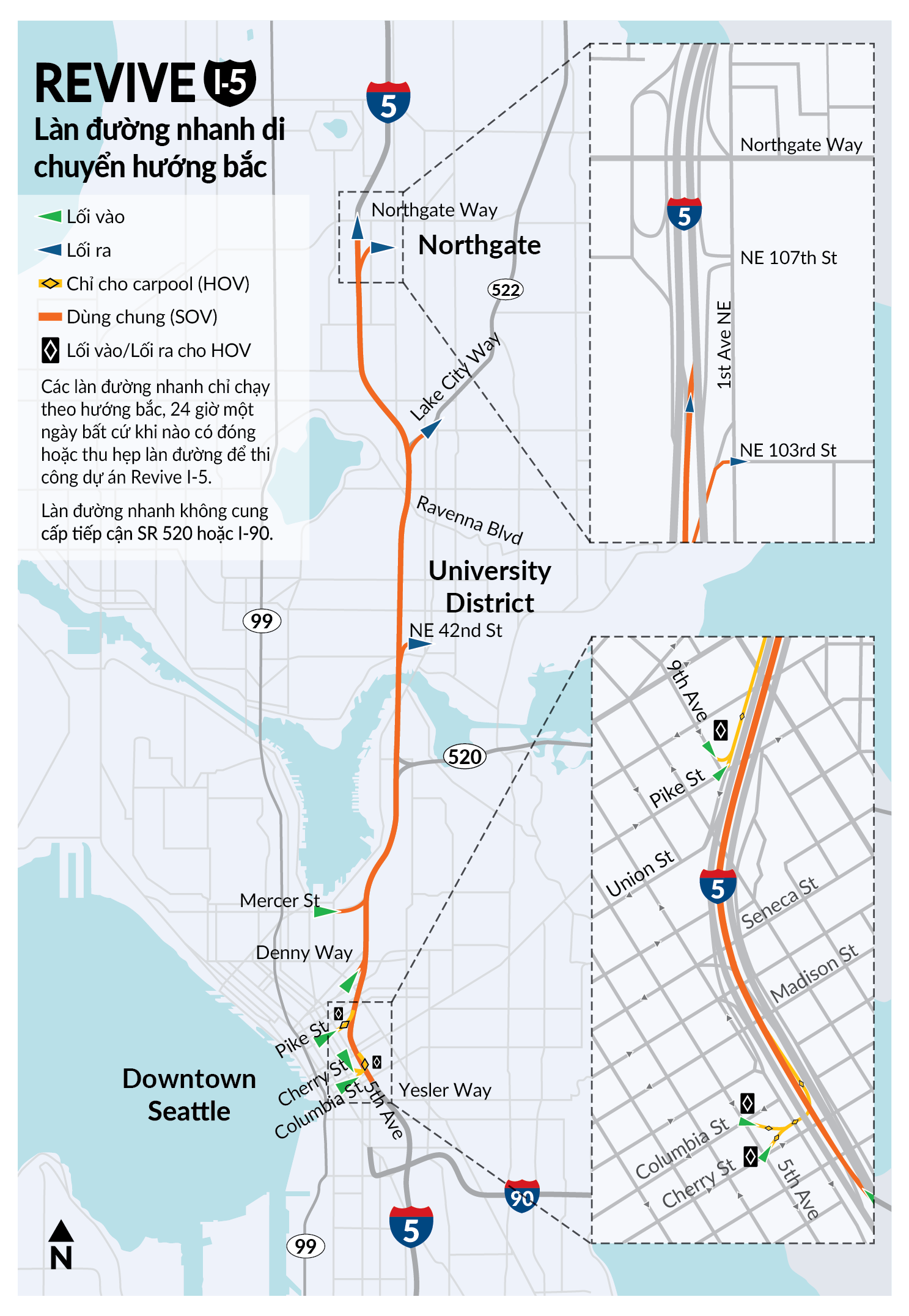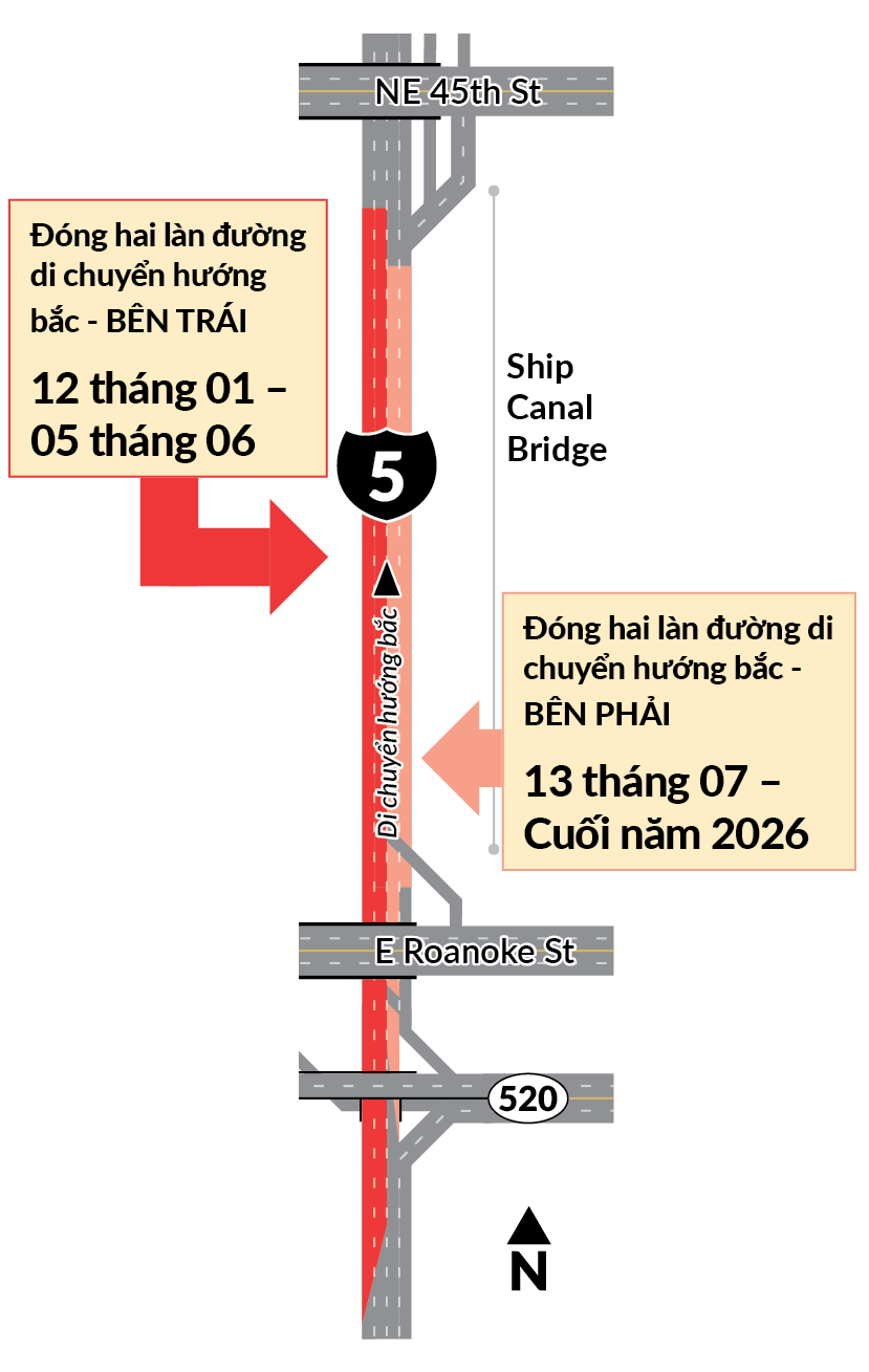 WSDOT sẽ cần đóng cửa hoàn toàn I-5 di chuyển hướng bắc vào cuối tuần, từ I-90 đến đường Northeast 45th Street để thiết lập và tháo dỡ các khu vực thi công trên cầu.Các làn đường nhanh sẽ hoạt động chỉ theo hướng bắc, 24 giờ một ngày trong toàn bộ thời gian thu hẹp và đóng hoàn toàn làn đường trên I-5 di chuyển hướng bắc để thiết lập và tháo dỡ các khu vực thi công trong nhiều tháng của năm 2026. Những ai đi về hướng bắc có thể vào làn đường nhanh từ trục đường chính I-5 di chuyển hướng bắc tại khu vực Chinatown-InternationalDistrict thuộc Seattle (lối vào từ bên trái), kèm các lối vào bổ sung từ trung tâm thành phố Seattle. Tất cả mọi người đều có thể sử dụng làn đường nhanh, ngoại trừ các lối vào và lối ra được đánh dấu chỉ dành cho HOV.
